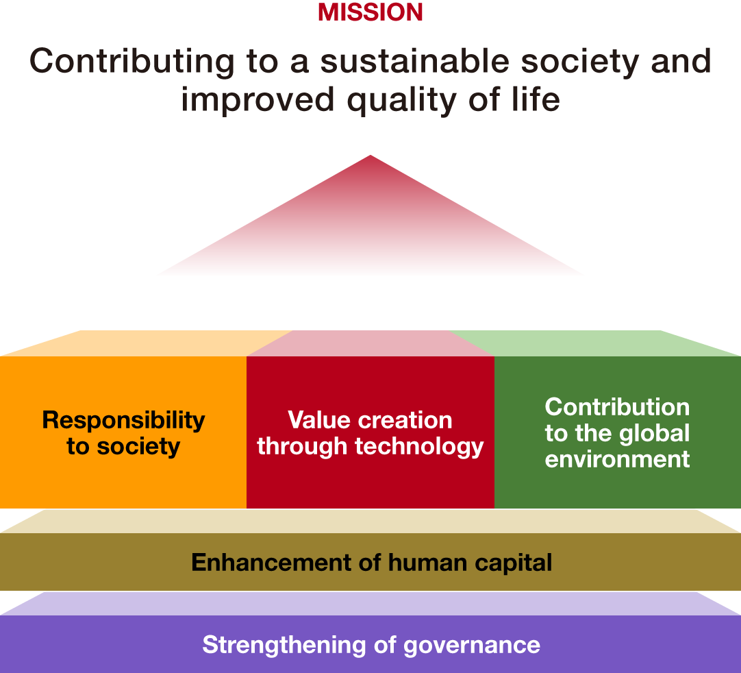 Aiming for sustainable corporate growth and to contribute to a sustainable society and enriched lives for people, we have identified nine material issues across five domains—“technology,” “society,” “global environment,” “human capital,” and “governance”—and are promoting initiatives that contribute to sustainability and are aligned with these material issues across the group.