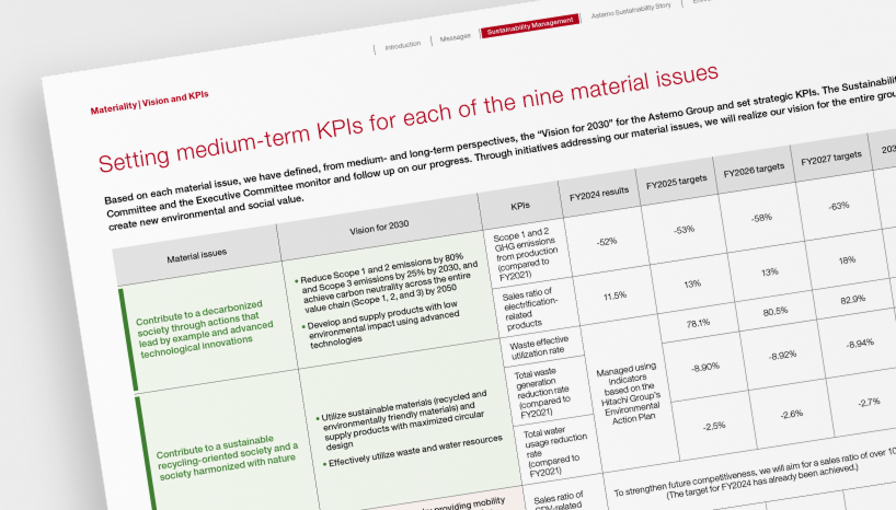 For each of the nine material issues (=materiality), issues, we have defined, from medium- and long-term perspectives, a Vision for 2030 for the Astemo Group and set strategic KPIs.